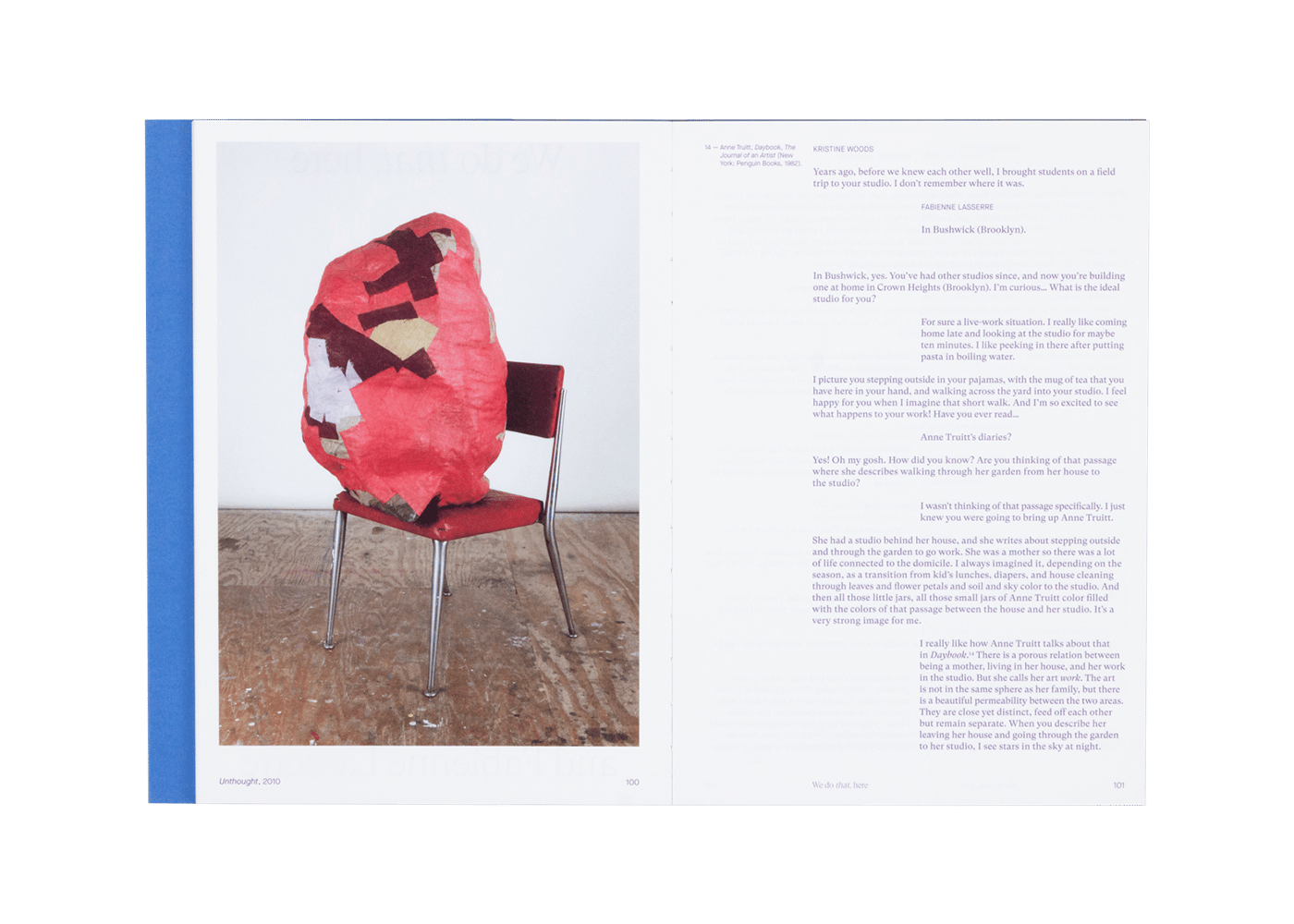 Fabienne Lasserre: Entre chien et loup is both a catalogue and artist book, bringing together three essays, a conversation, and numerous images of the artist’s work, process, and inspiration. Entre chien et loup (an expression for twilight), speaks to the way Lasserre’s work defies easy categorization, hovering around, across, beyond, and beside painting and sculpture. For Lasserre, abstraction is a means to privilege lived and felt experience, implying powerful and fertile political metaphors. Contributions by curators Camila Marambio and Dean Daderko, art historian Nell Andrews, and artist Kristine Woods, all presented in both English and French, provide intimate and lyrical weaving of viewpoints on materials, the senses, resistance, and queer and feminist viewpoints.